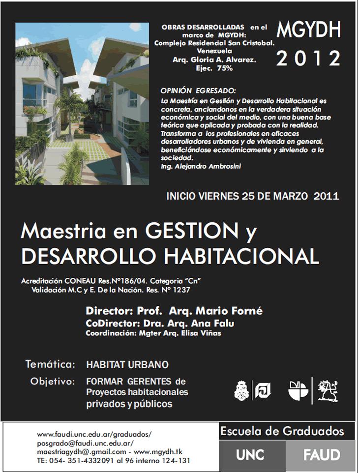 Maestria en Gestion y Desarrollo Habitacional 2012 29/03/2012 Comunicación No comments No comments Maestría en Gestión y Desarrollo Ambiental Clases inician 13 de abril Escuela de Graduados UNC FAUD