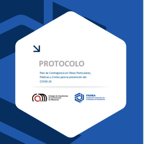 El Colegio de Arquitectos de Misiones ante los eventos plateados, que son de público conocimiento, EMERGENCIA SANITARIA, que nos afecta a nivel mundial y de la cual no somos ajenos los profesionales independientes de nuestra provincia, articuló conjuntamente con la Federación que nos nuclea, el estudio, análisis y la elaboración de un Protocolo de Acciones y Prevención de trasmisión y contagio en Obras Particulares, Públicas y Civiles.Esta propuesta, la hemos elevado como aporte al Poder Ejecutivo Provincial, al Poder Legislativo y la Municipalidad de Posadas, y remitido Distritos y Delegaciones, para sus respectivas gestiones .